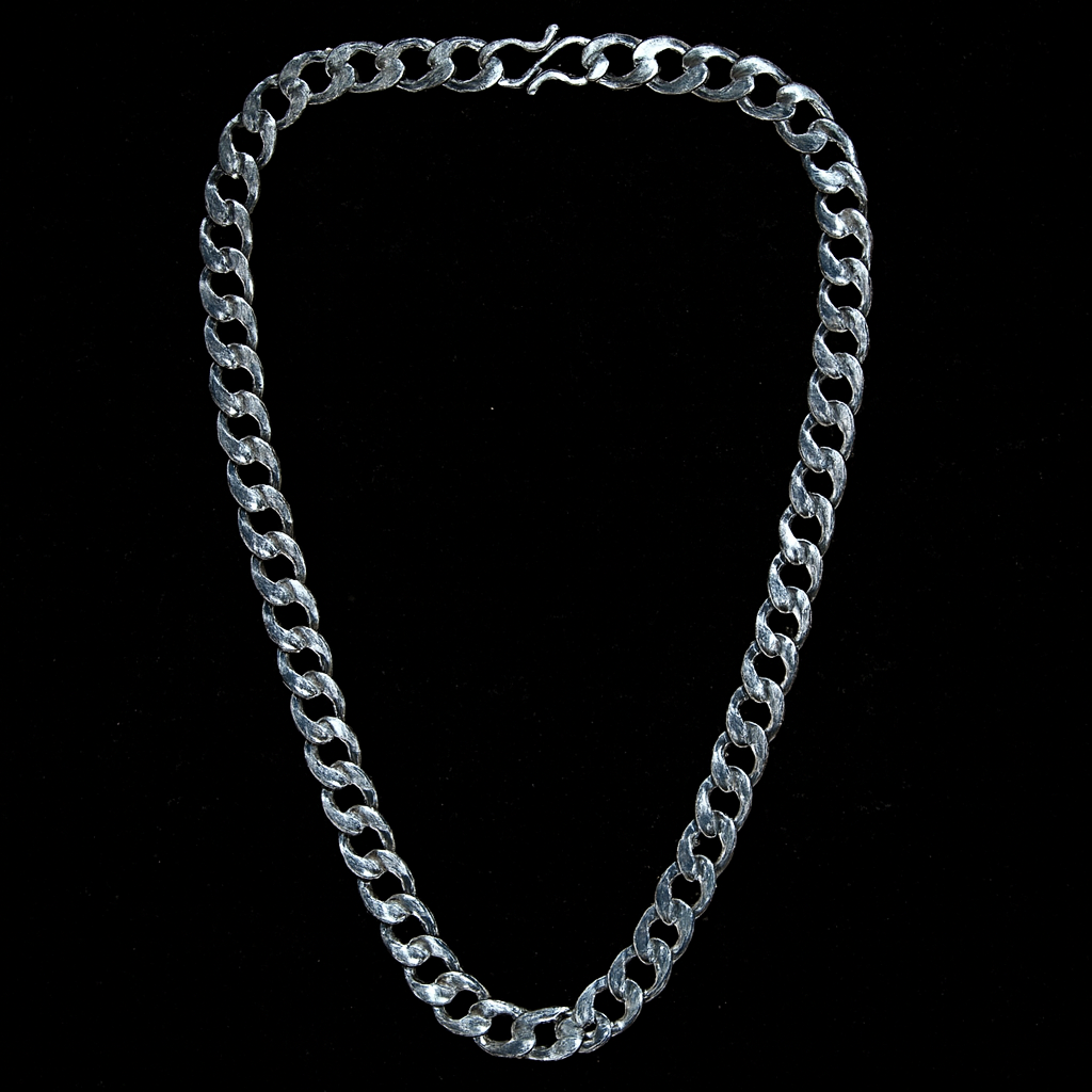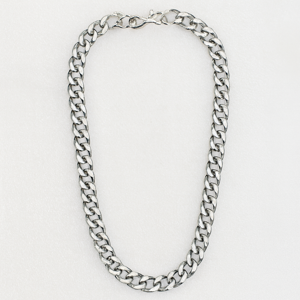 Description: Make a statement with this bold silver curb chain necklace, designed with heavy interlinked links that showcase strength and style. Its polished finish ensures a sleek, contemporary appeal, while the secure clasp provides ease of wear. Perfect for pairing with casual outfits or layering with pendants, this versatile chain is a must-have accessory for fashion-forward individuals.