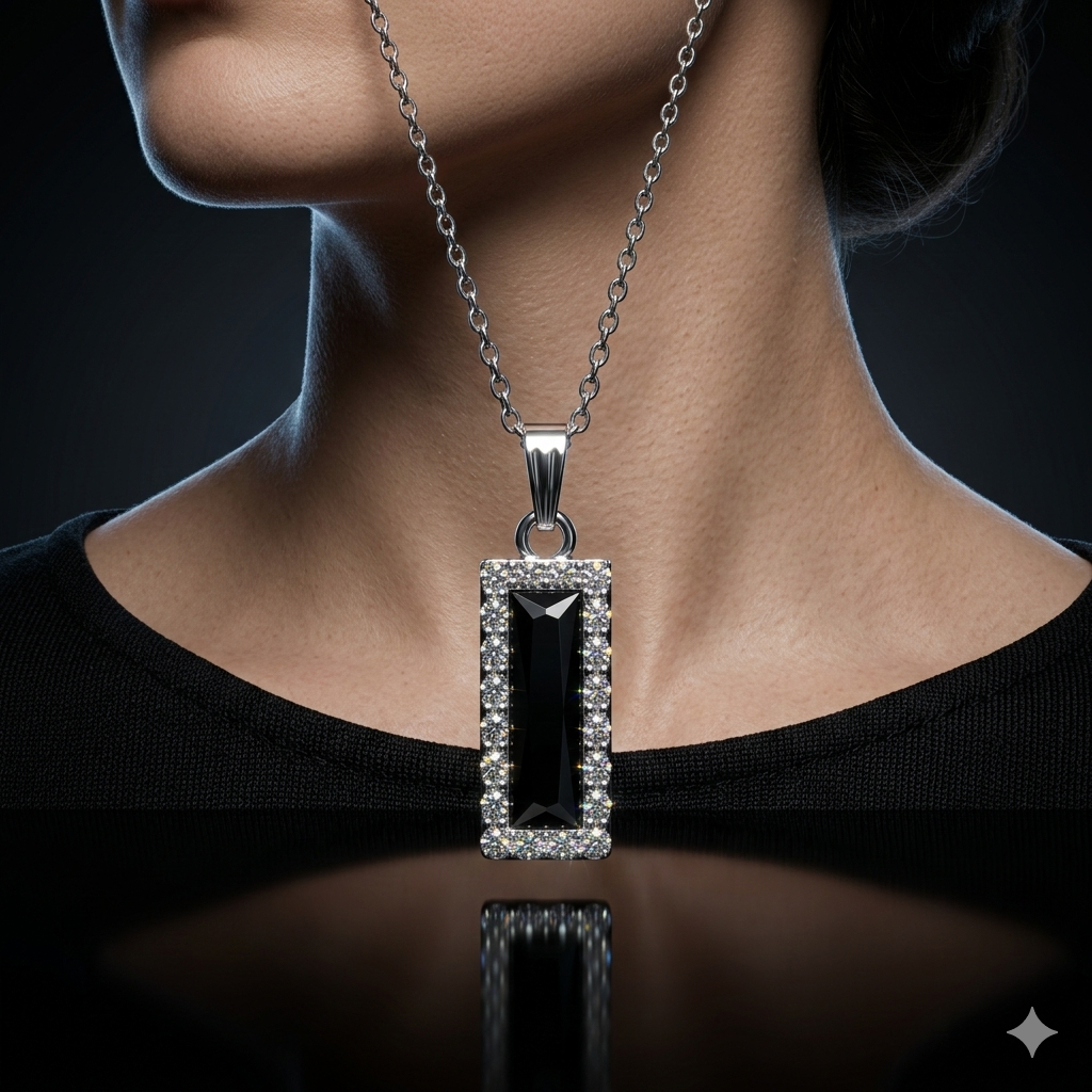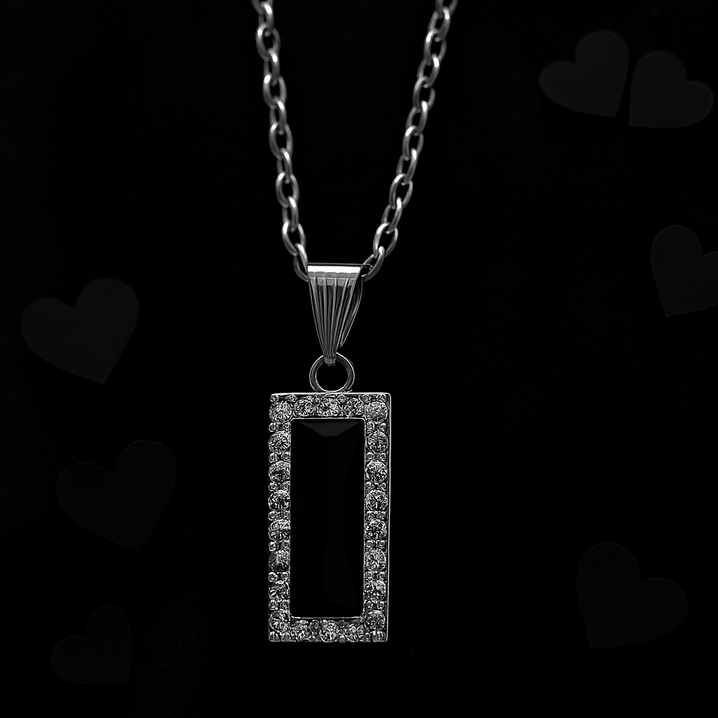Make a statement with this striking rectangular pendant necklace, featuring a faceted black gemstone at its center. Surrounded by a halo of sparkling clear stones and set in a polished silver-toned frame, this piece blends bold contrast with timeless elegance. The twisted silver chain adds texture and sophistication, making it perfect for both formal occasions and everyday style.