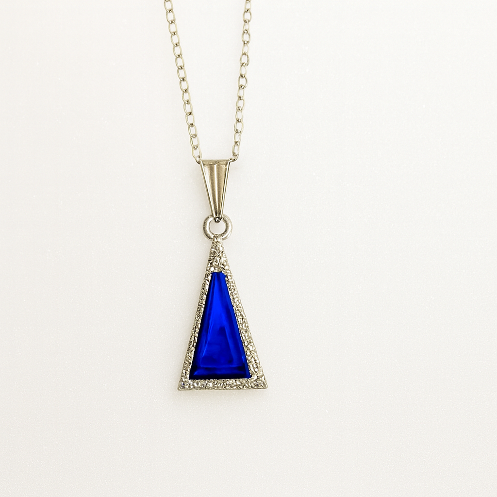 Add a touch of modern elegance to your look with this stunning pendant necklace. Featuring a vibrant blue triangular gemstone framed by a halo of shimmering clear stones, this piece is a perfect blend of bold design and timeless sparkle. The pendant is suspended from a delicate silver-toned chain, making it ideal for both everyday wear and special occasions.
