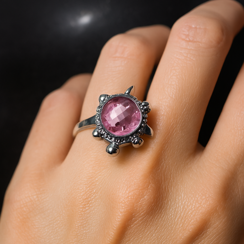- 💎 Gemstone: Faceted round pink stone with checkerboard brilliance