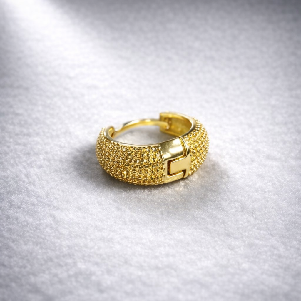 The Regal Edge Earring is a striking piece designed for men who appreciate bold style with refined craftsmanship. Its wide, gold-toned band showcases a detailed beaded texture that radiates strength and sophistication. The shimmering surface catches light beautifully, giving the earring a premium, commanding presence. At the center lies a smooth, polished section adorned with a geometric motif, resembling an interlocking design that symbolizes balance, power, and individuality.