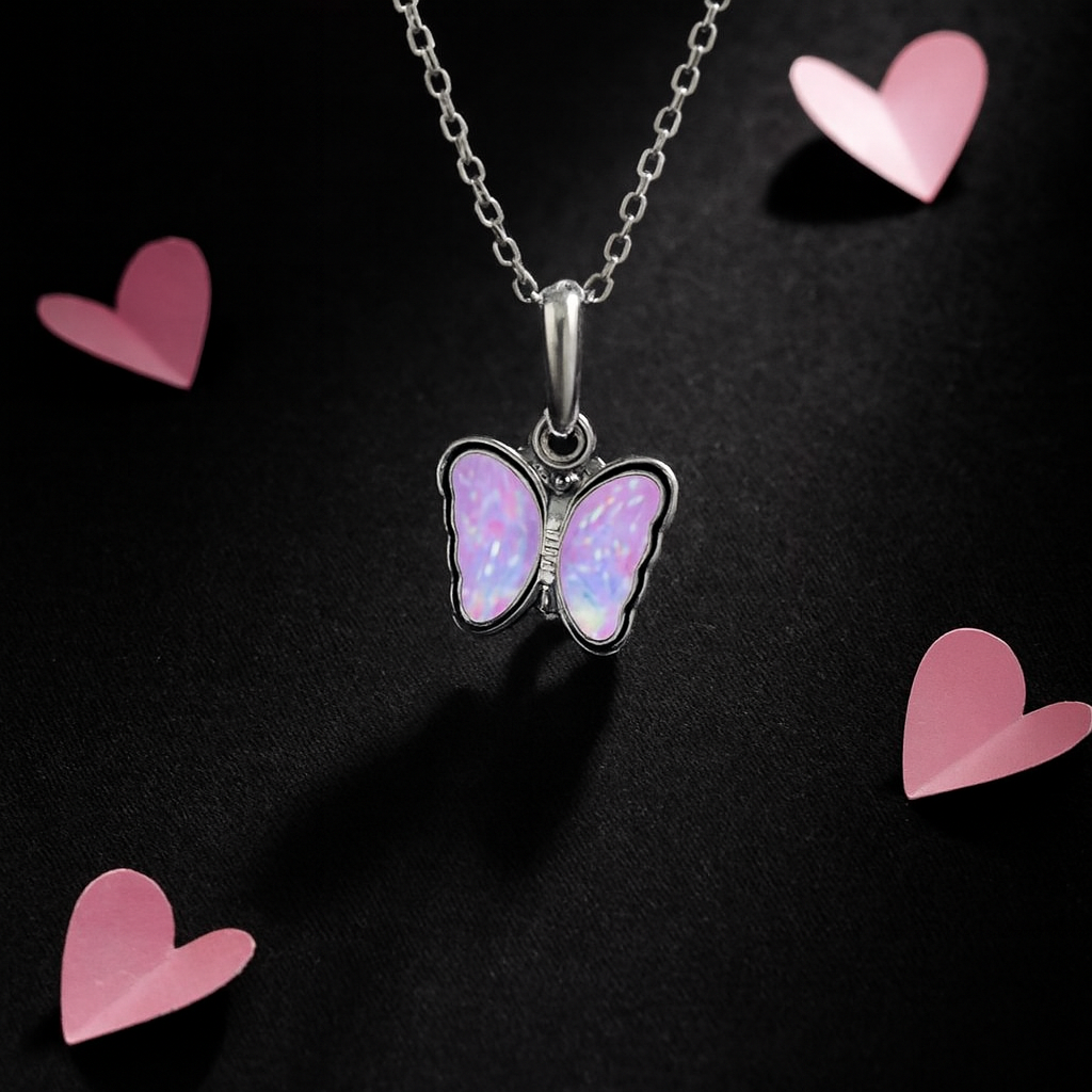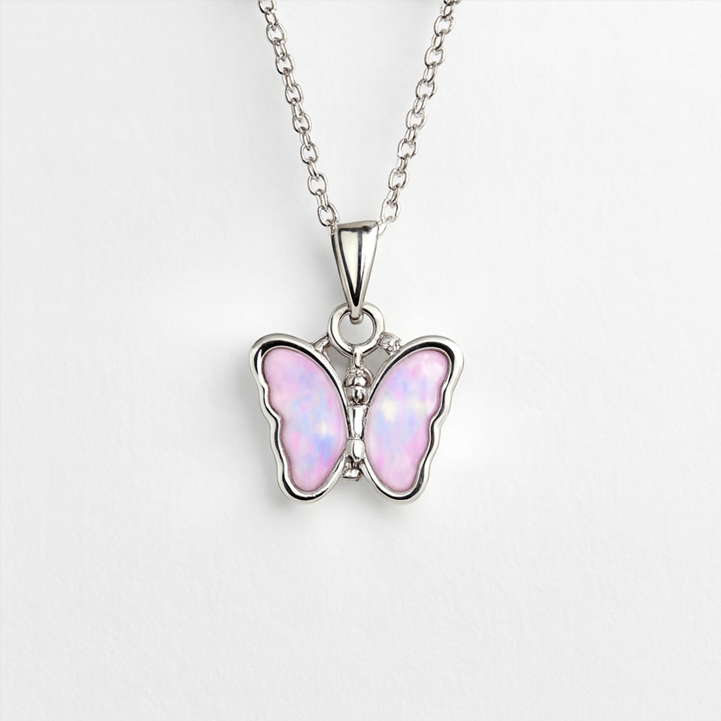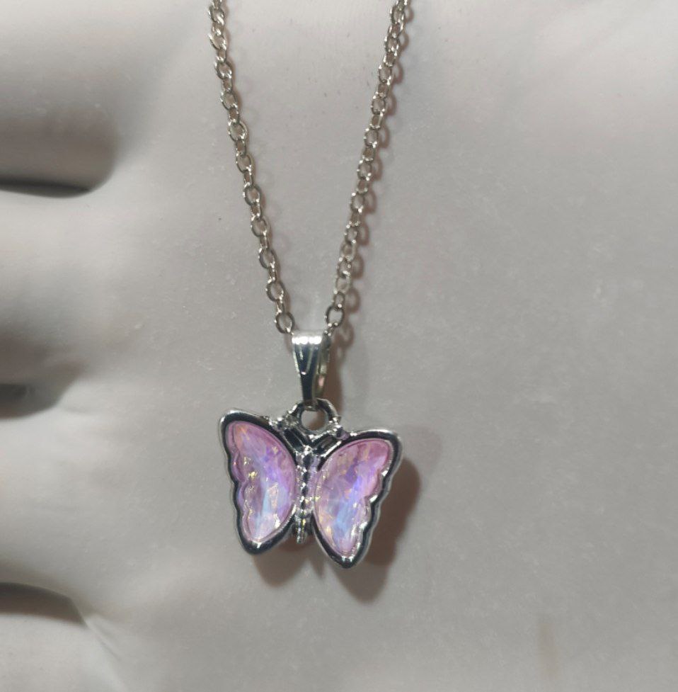 Elevate your style with this enchanting butterfly pendant necklace, crafted to capture the delicate beauty of nature. The pendant features shimmering light purple-pink wings with an iridescent finish, framed in sleek metal for a refined look. Suspended from a polished silver-toned chain, this piece adds a touch of whimsy and elegance to any outfit.