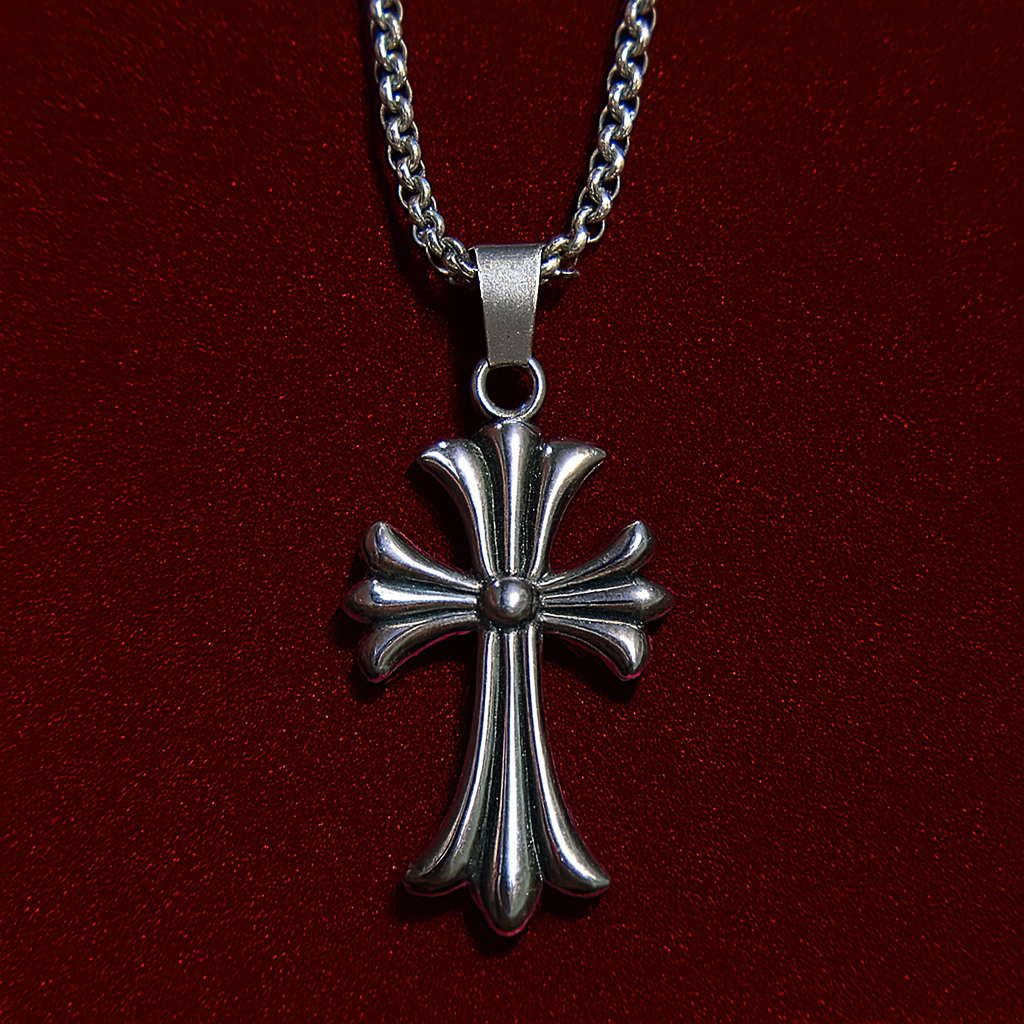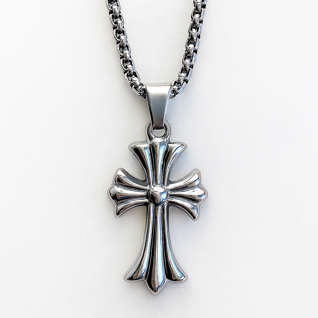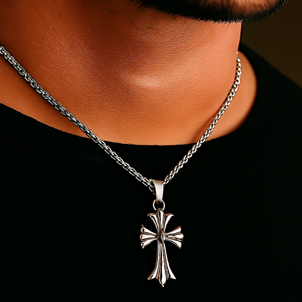 Make a bold statement of faith and style with this Gothic-inspired silver cross pendant necklace. Featuring flared arms and a raised central sphere, this intricately crafted piece blends spiritual symbolism with modern masculinity. Styled on a real male model, the pendant rests naturally against the neckline, offering a confident, wearable look that complements both casual and festive outfits.