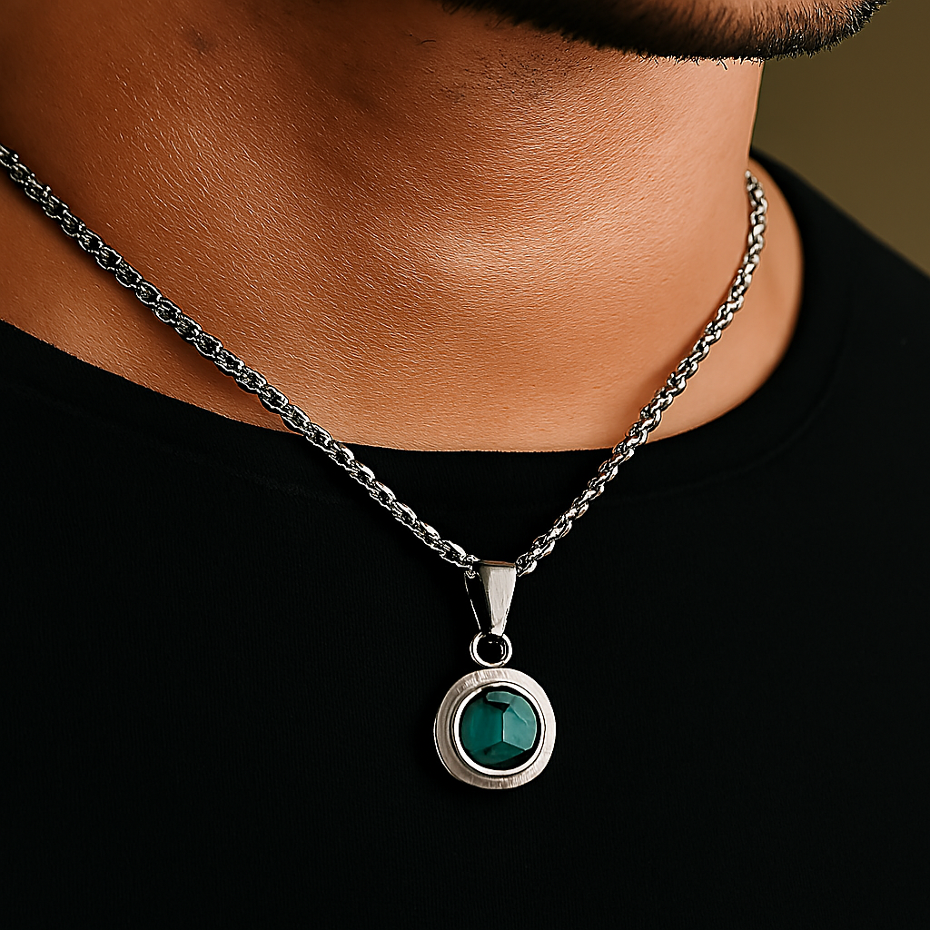 Add a touch of timeless charm to your look with this emerald green gemstone pendant necklace, crafted for the modern man who values subtle luxury. The faceted round-cut stone is set in a polished silver bezel, reflecting light with every movement. Styled on a real male model, this piece showcases how effortlessly it complements everyday wear — from casual tees to festive attire.