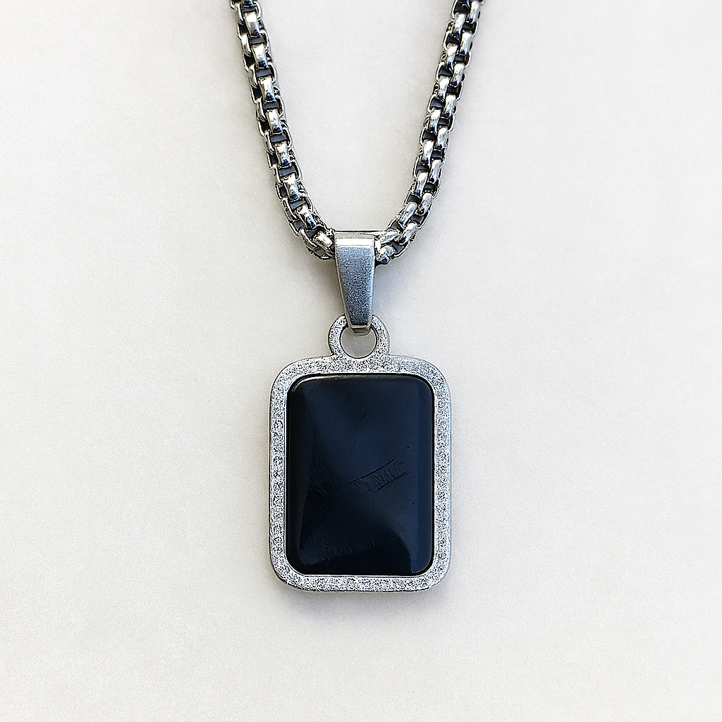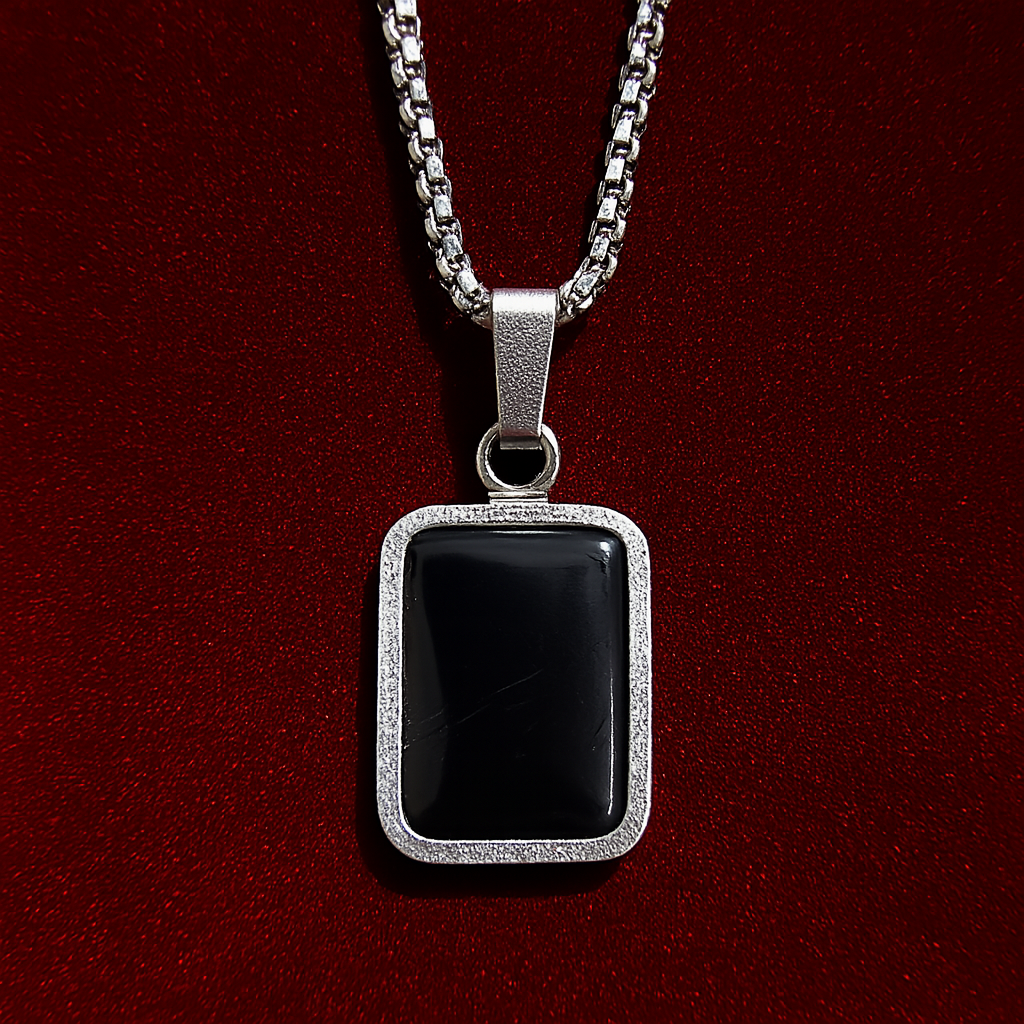 Crafted for the man who values quiet strength and timeless style, this rectangular black onyx pendant necklace blends rugged charm with refined elegance. The glossy black stone is framed in textured silver, suspended from a sturdy box chain that rests naturally on the skin. Styled on a warm wooden surface with earthy accessories, this piece evokes craftsmanship and character — perfect for gifting or personal expression.