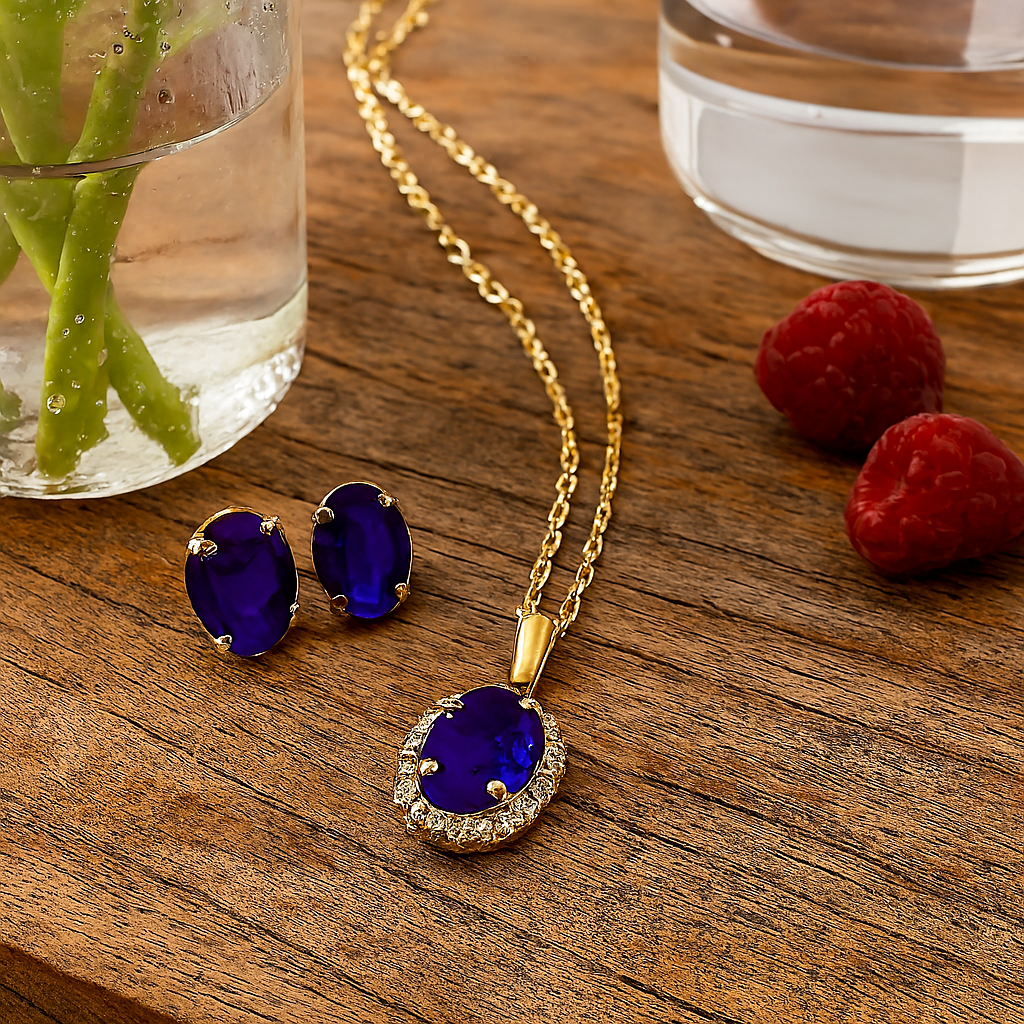 - Metal finish: Warm gold-tone settings and chain.
