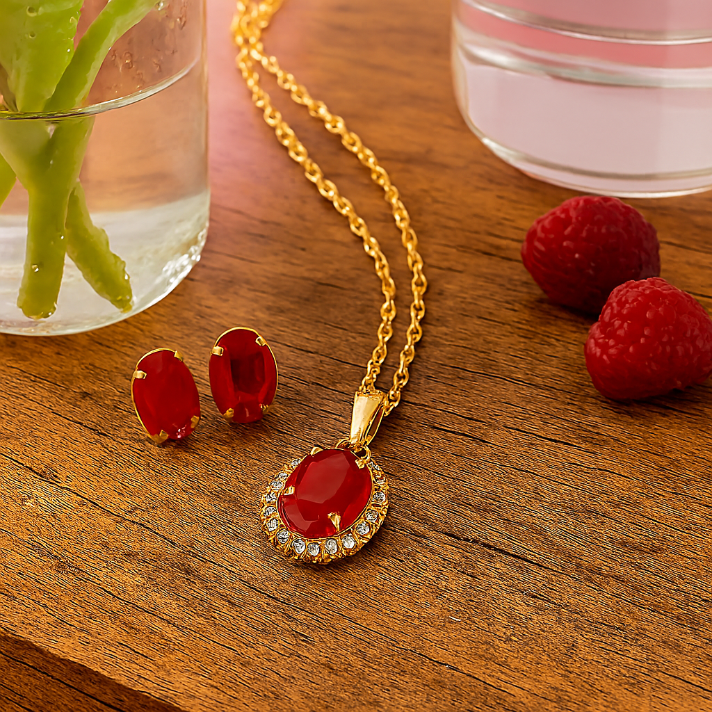 - Metal finish: Warm gold-tone settings and chain.