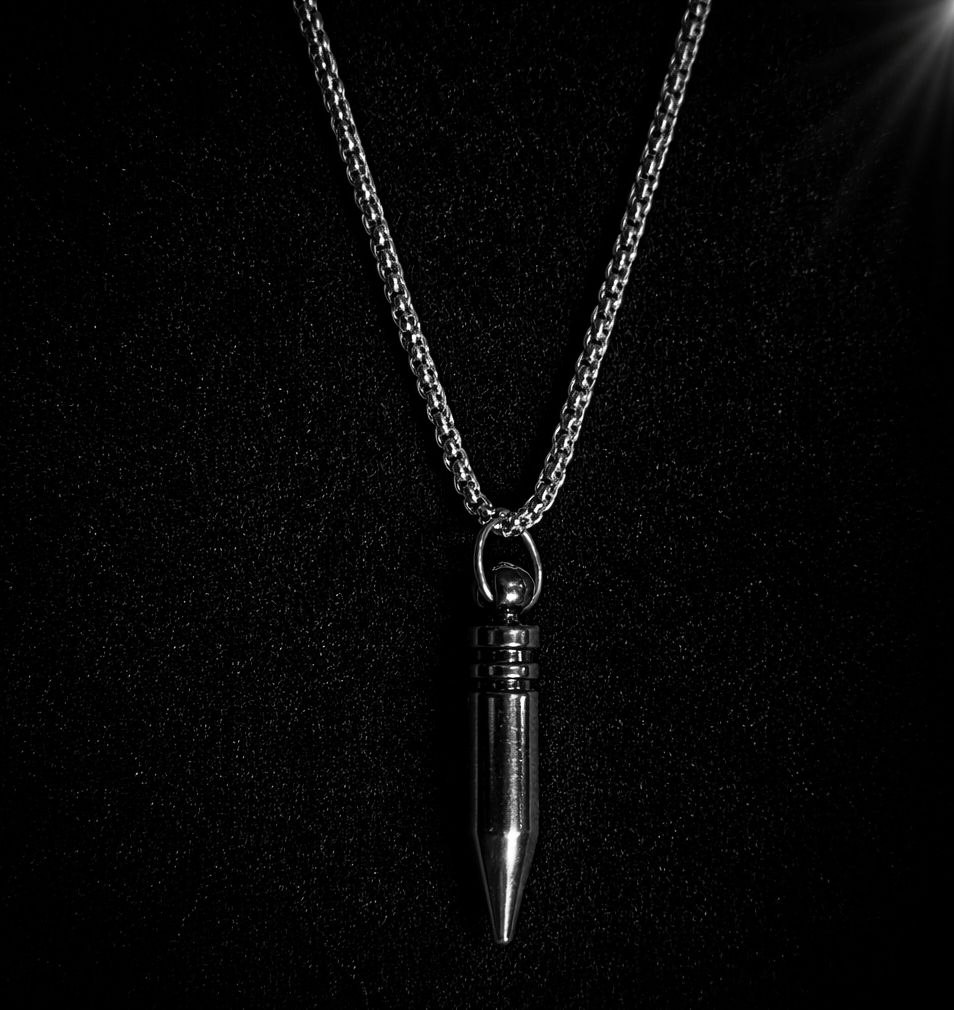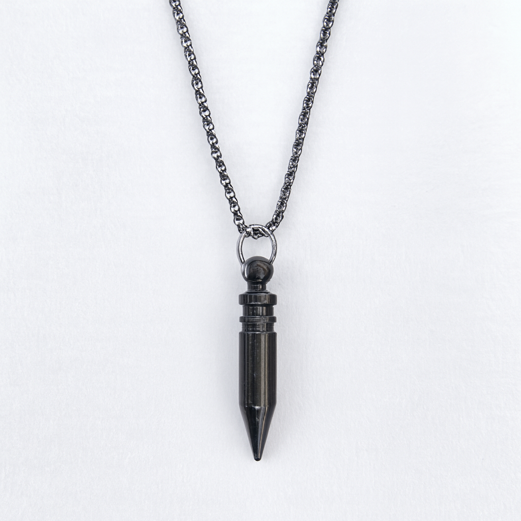 Elevate your style with the Obsidian Plumb Pendant Necklace, a sleek black metallic accessory designed for both fashion and spiritual enthusiasts. The pendant is crafted in the shape of a plumb bob, featuring a cylindrical body with fine grooves and ridges that taper into a sharp, elegant point. Suspended from a matching black chain, this necklace offers a bold industrial look that pairs effortlessly with casual wear or statement outfits.