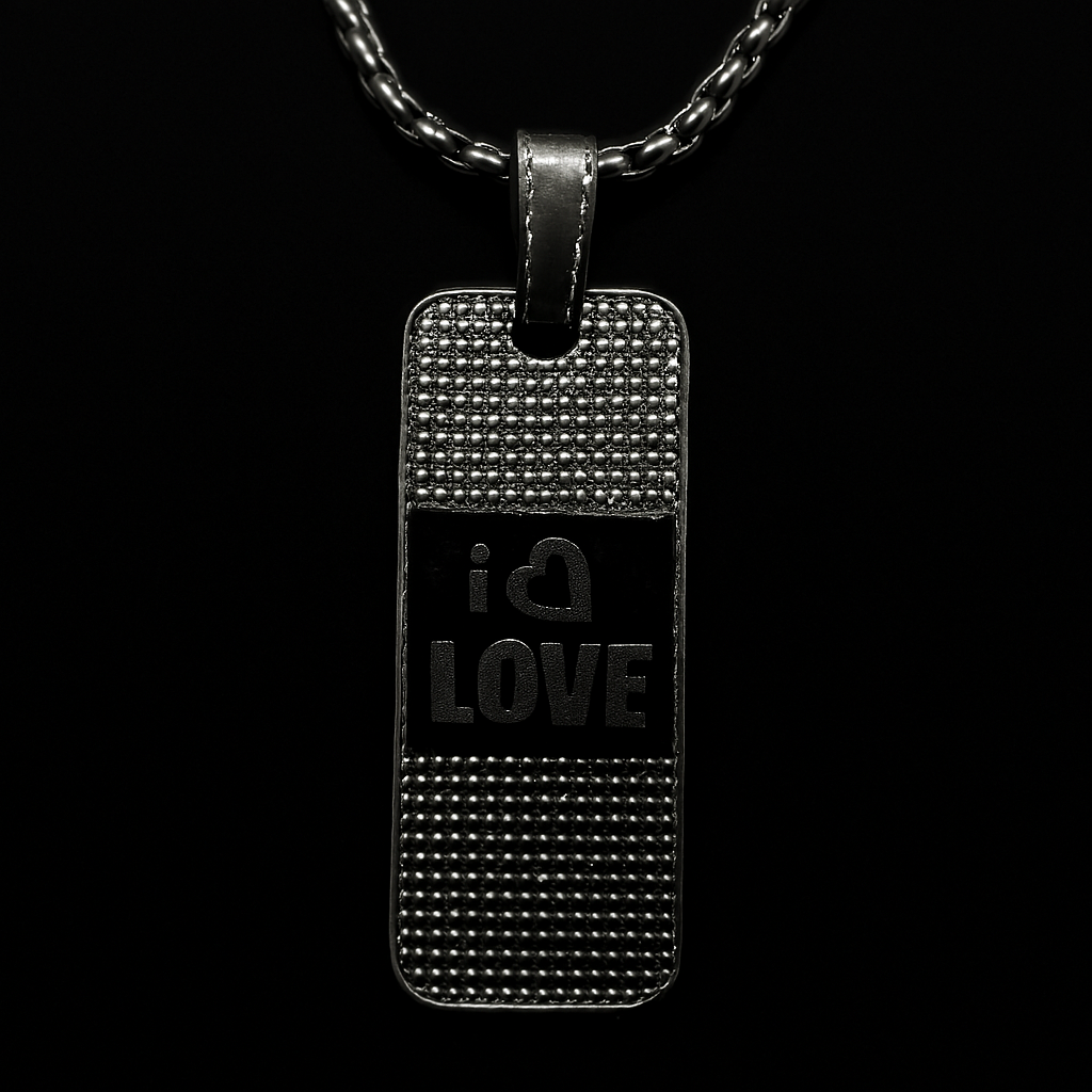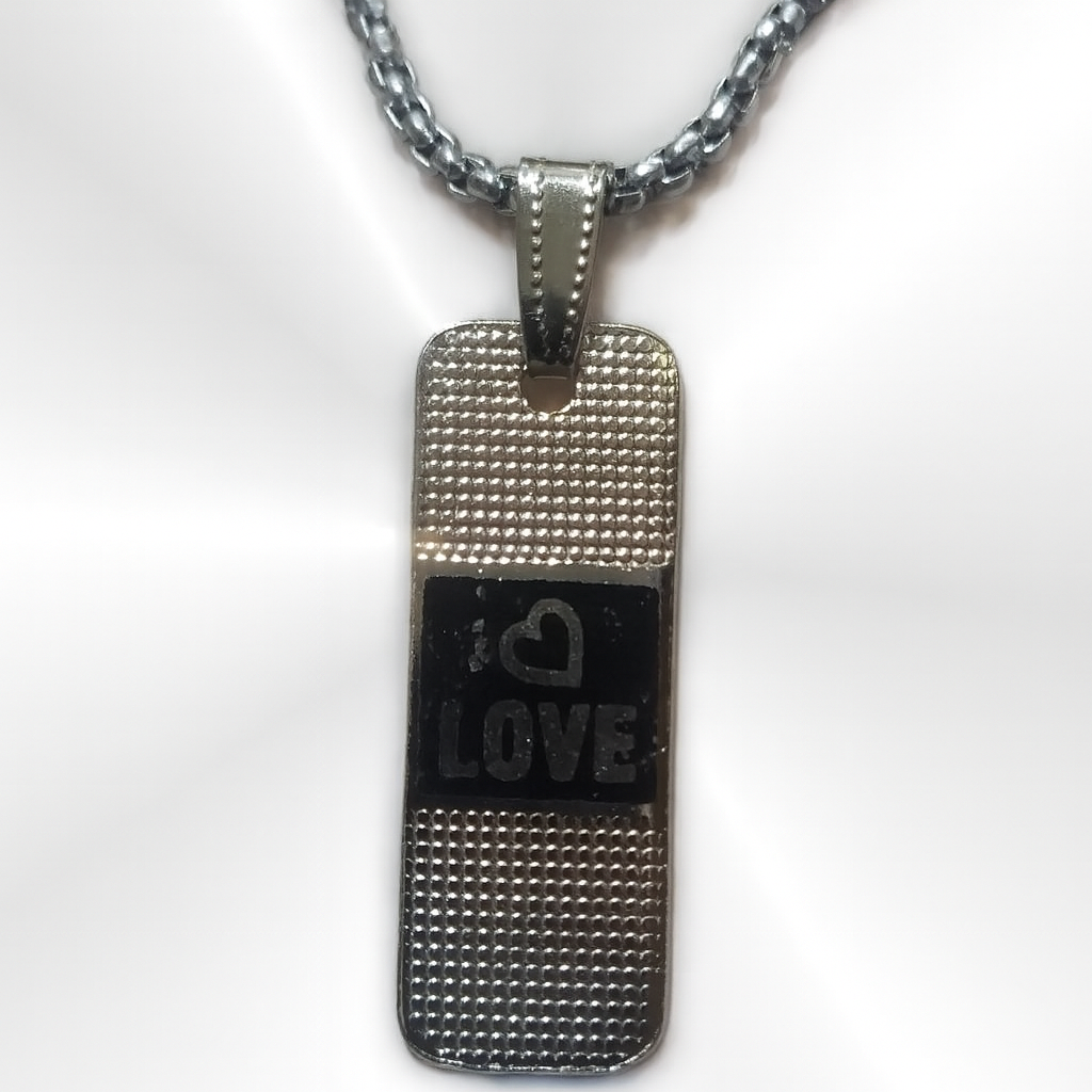 Express your affection with this stylish silver pendant necklace featuring a bold “I ♥ LOVE” engraving. The rectangular pendant showcases a textured surface with raised dot detailing on the top and bottom, while the smooth black center highlights the heartfelt message. Suspended from a sleek silver chain, this piece blends modern design with emotional elegance—perfect for gifting or personal wear.