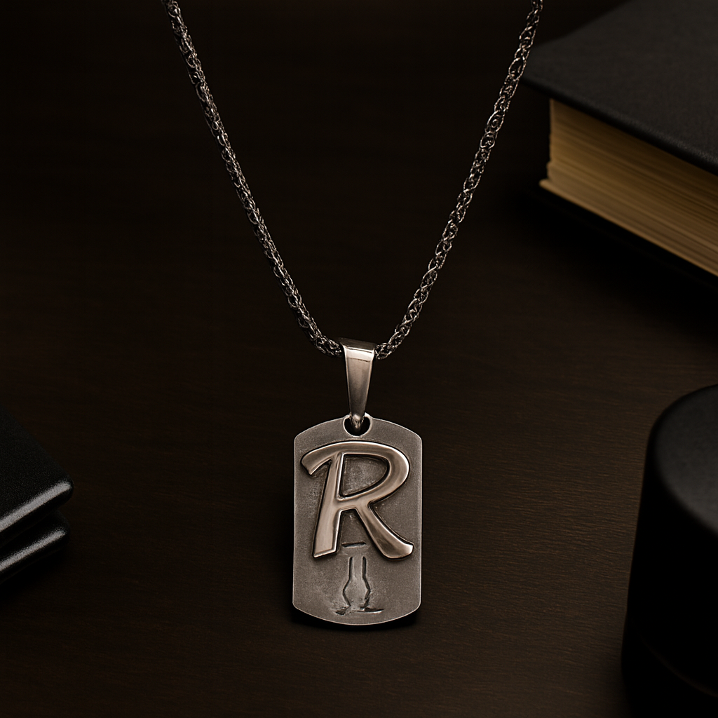 • Pendant Design: Rectangular dog tag with rounded edges, raised black “R” initial, and subtle vertical motif below