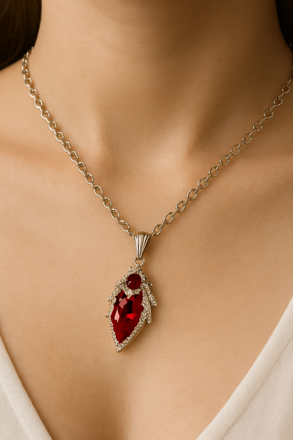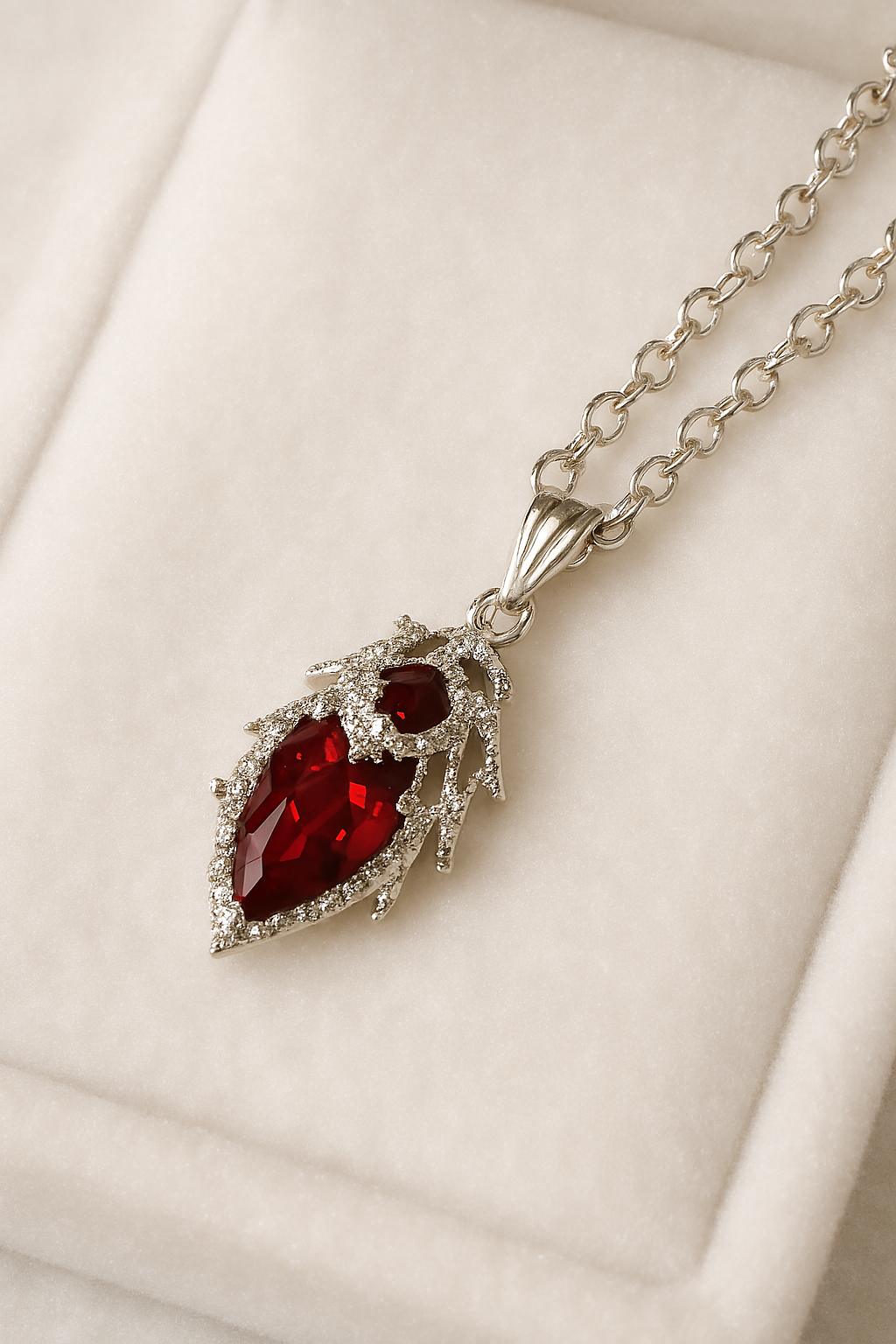 🔗 Suspended from a polished silver chain with interlocking oval links, the pendant is anchored by a fluted bail with vertical grooves—offering texture and refinement. The entire piece rests against a soft white velvet-inspired background, with a subtle shine that elevates its visual appeal.
